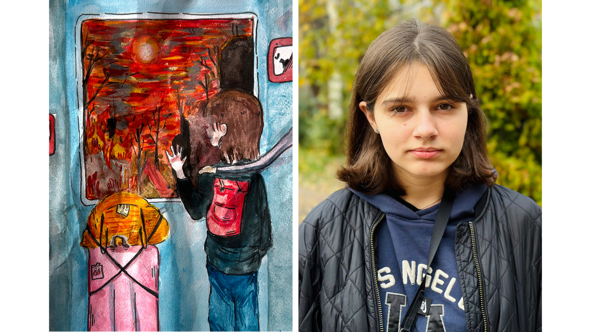 “Mom said we were going to visit friends, but we packed all our things. Even then I realized that we might not return. But the whole way to a new place, the whole way, I just really believed that we would return home one day. All the way I saw destruction, I don’t know exactly where we were going, but it was somewhere on the outskirts of Chernihiv. It was scary to see so much destruction, as if everything was burning, that’s why I depicted it in the picture.”